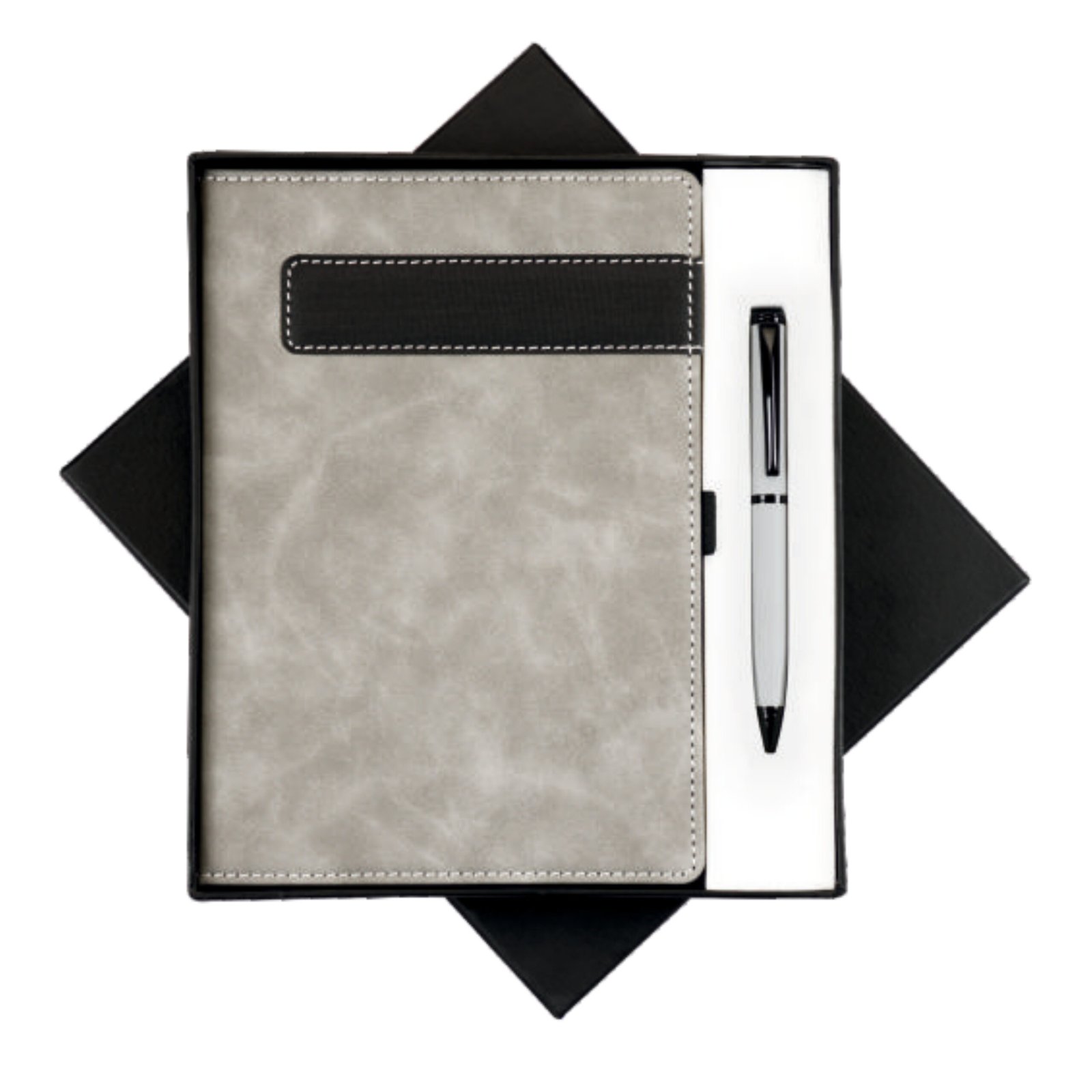 ₹830.00A classy 2-in-1 corporate gift set featuring an A5 hardbound dateless notebook paired with a premium metal ball pen. Designed in elegant grey vegan leather and packed in a sleek card board gift box. Ideal for employee gifting, conferences, seminars, events, and corporate branding.