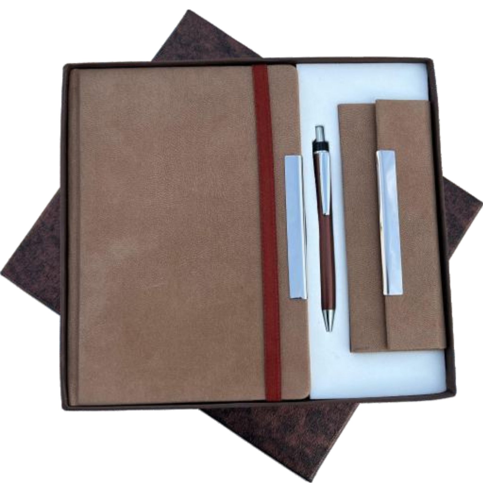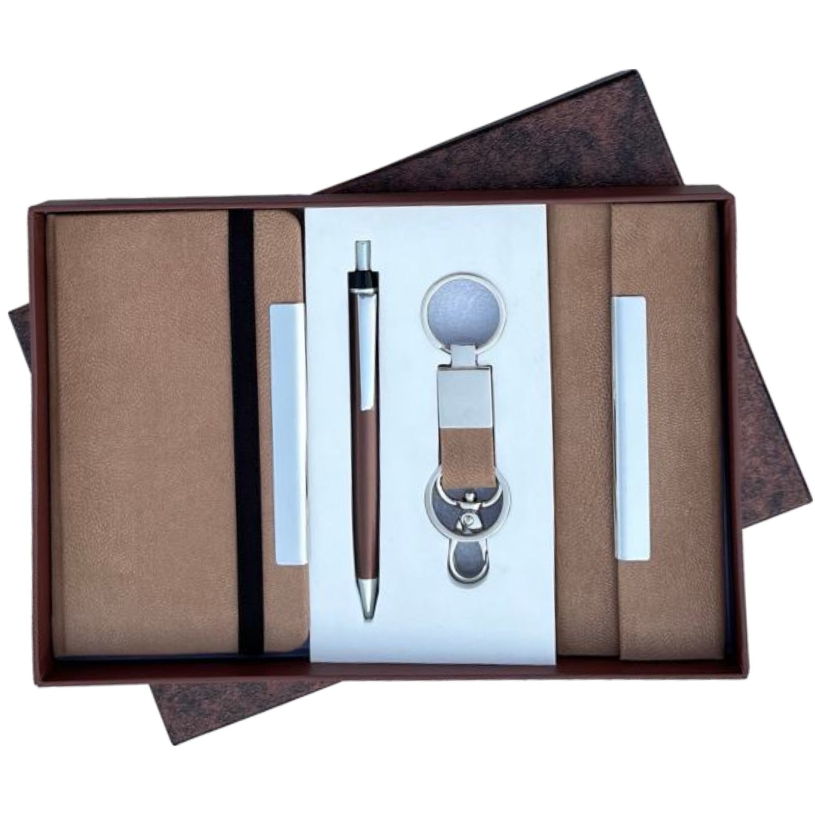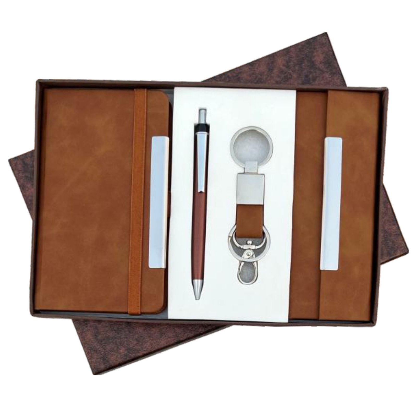 ₹1,165.00A stylish and functional 3-in-1 gift set designed for professionals, executives, and corporate gifting. This premium combo includes a high-quality notebook, a sleek metal ball pen, and a vegan leather key ring with dog-hook fitting—elegantly packed in a durable gift box.