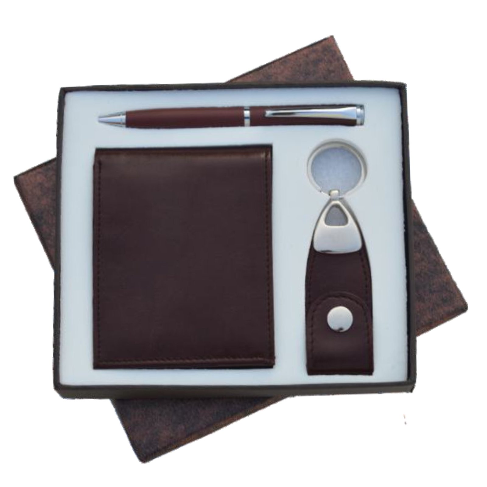 A stylish 3-in-1 corporate gift set featuring a premium vegan leather gents wallet, matching key ring, and a sleek metal ball pen. Designed for everyday utility and premium gifting, this combo comes neatly packed in an elegant card board box. Available in Brown / Tan.