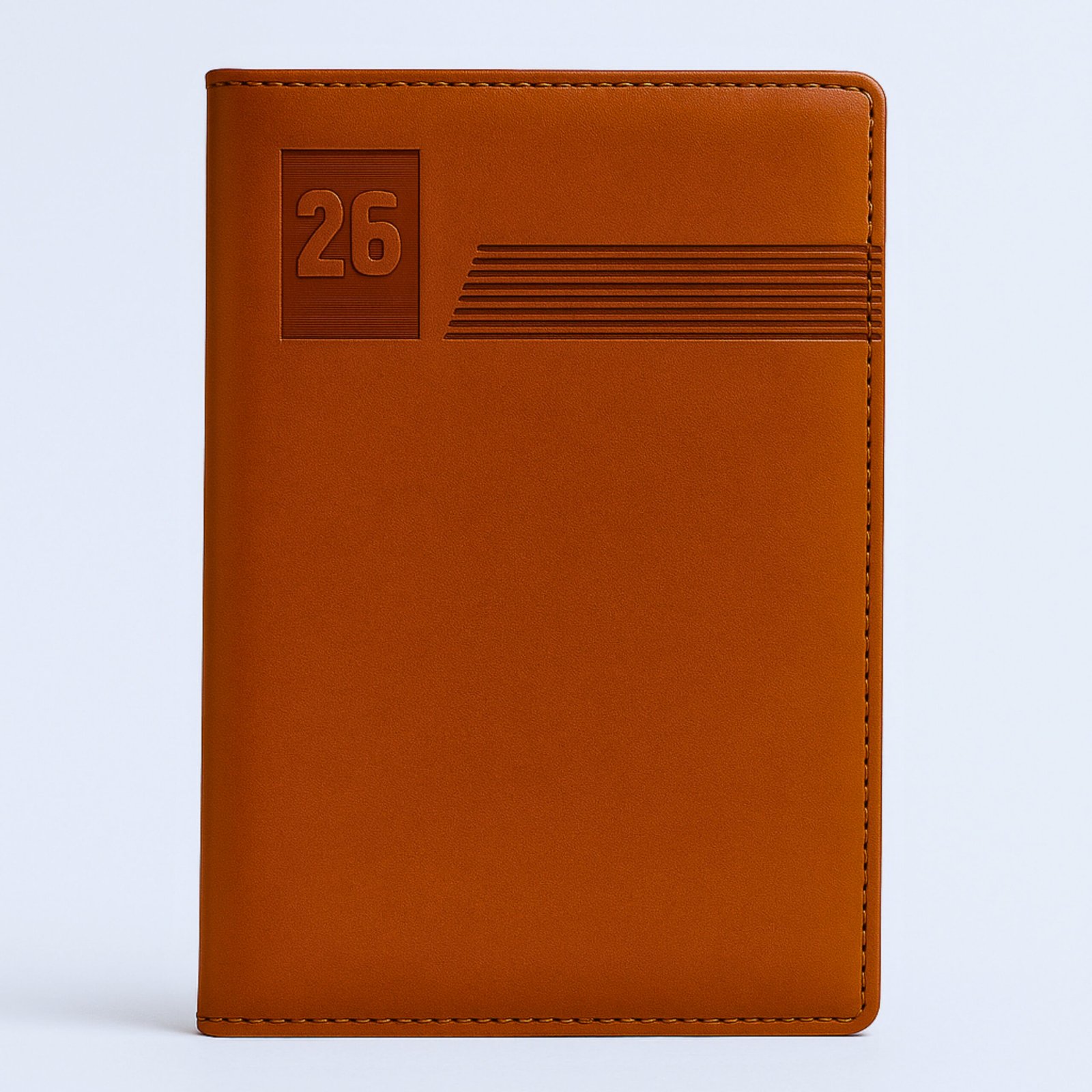 Tan diary with embossed “26” and line pattern