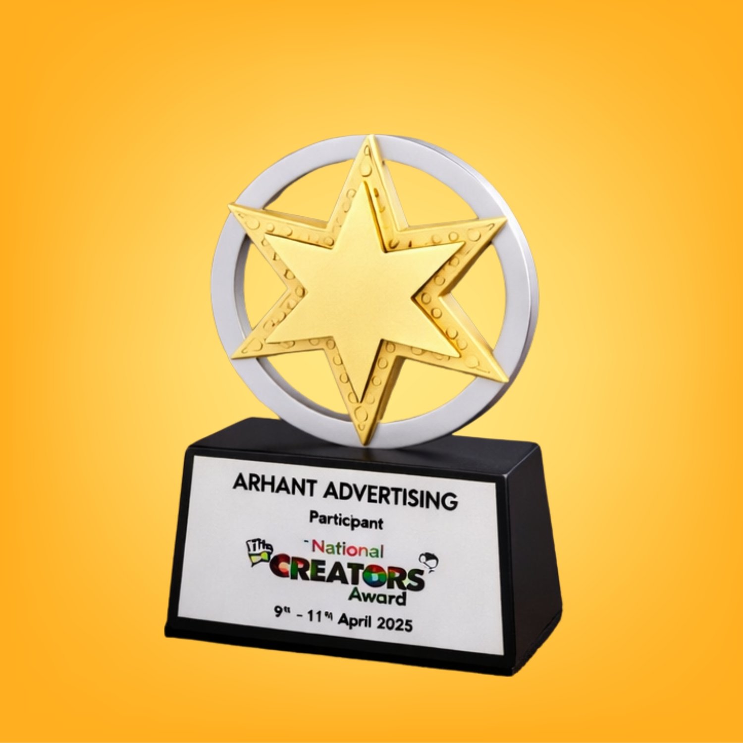 A stylish and modern star trophy crafted with a striking gold centerpiece inside a sleek circular frame. Mounted on a sturdy black base with a customizable front plate, this award is perfect for participants, achievers, and special recognition events. Its compact yet premium design makes it ideal for corporate functions, school competitions, cultural programs, and creative awards.
