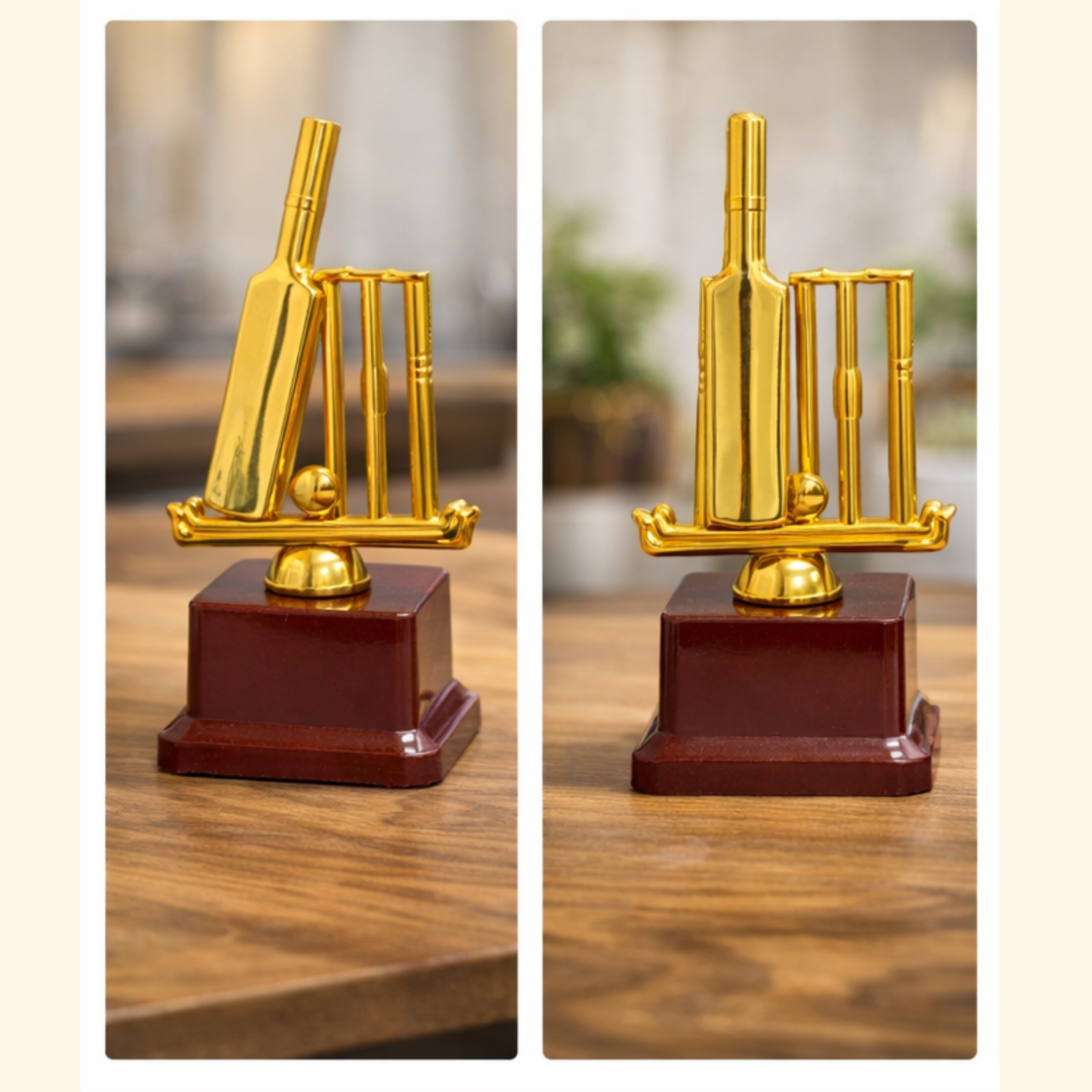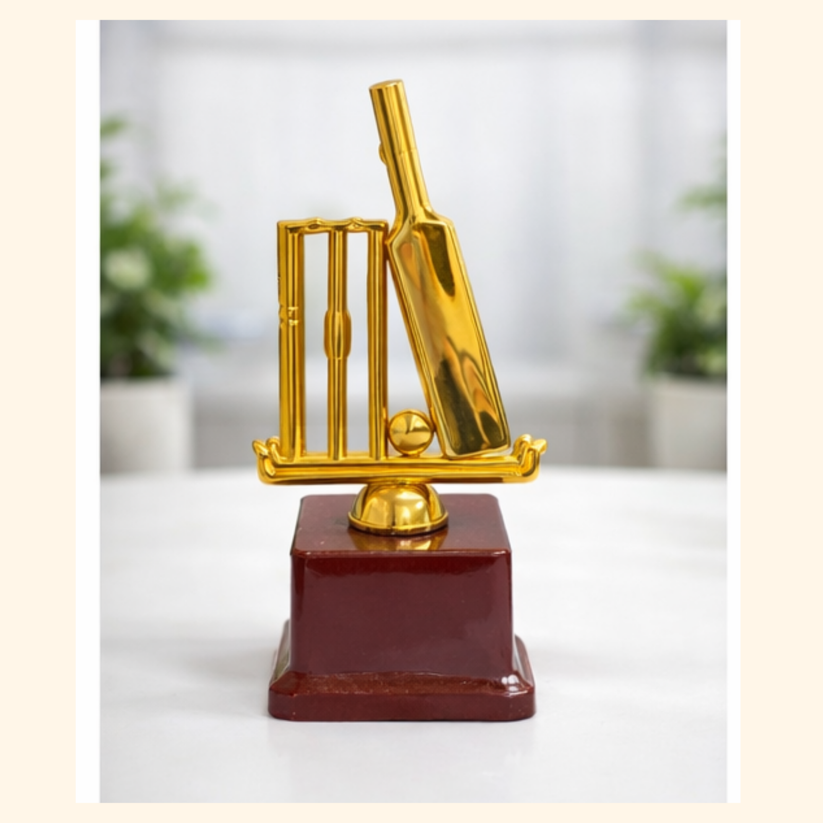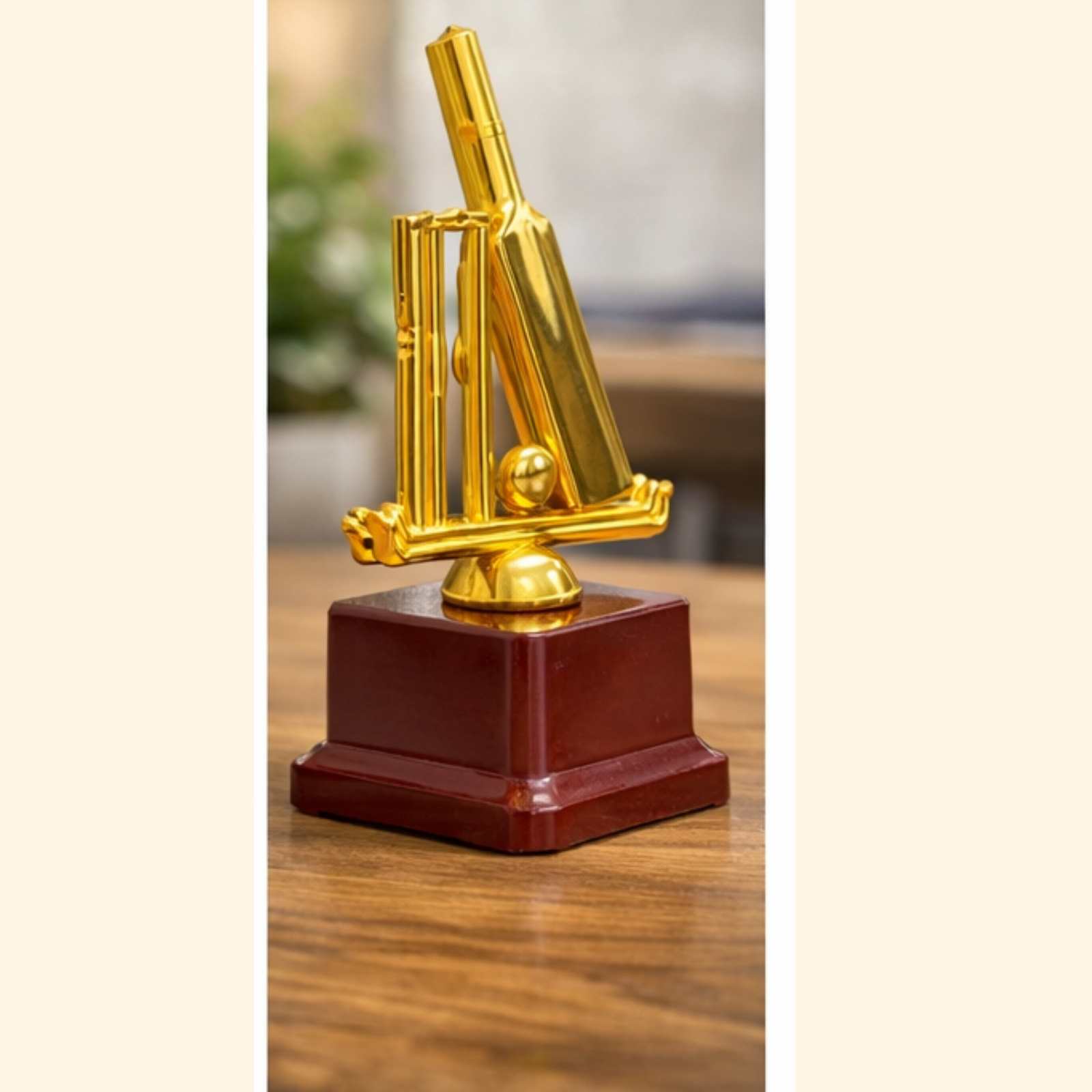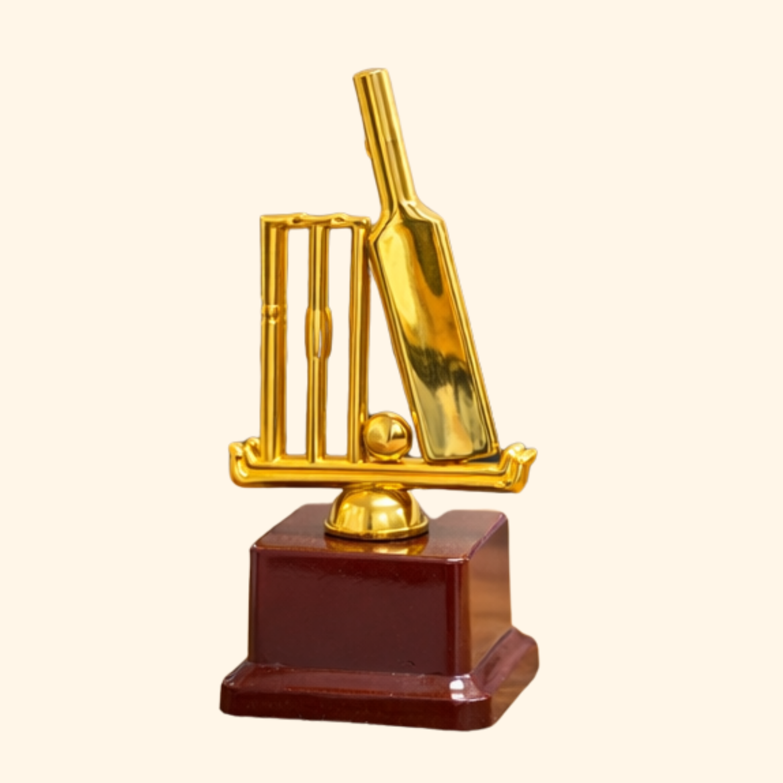 Celebrate cricketing excellence with our Golden Cricket Bat & Stumps Trophy, a perfect symbol of victory and sportsmanship. Designed with a detailed golden bat, stumps, and ball mounted on a sturdy wooden base, this trophy offers a premium look ideal for tournaments, leagues, schools, clubs, and corporate sports events.