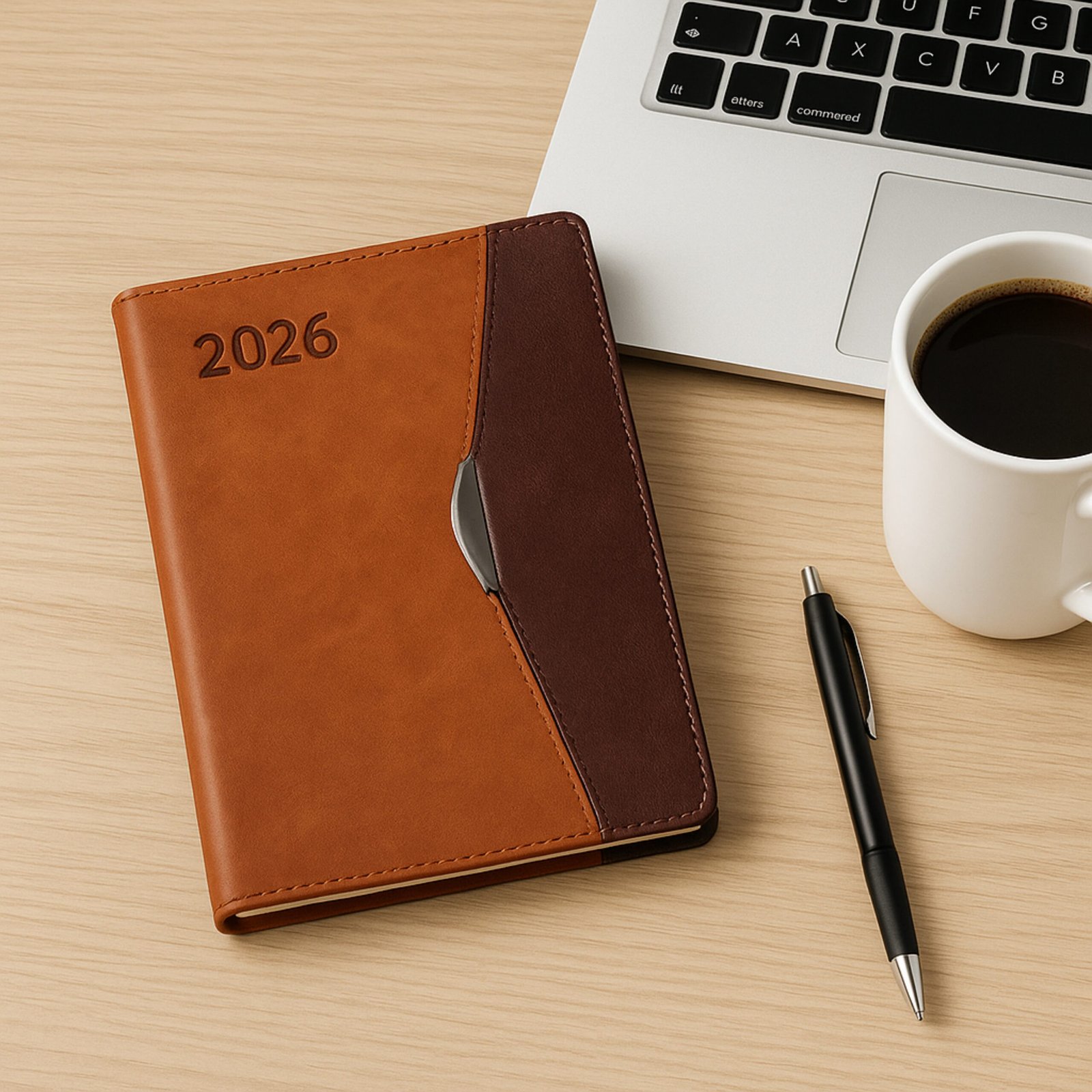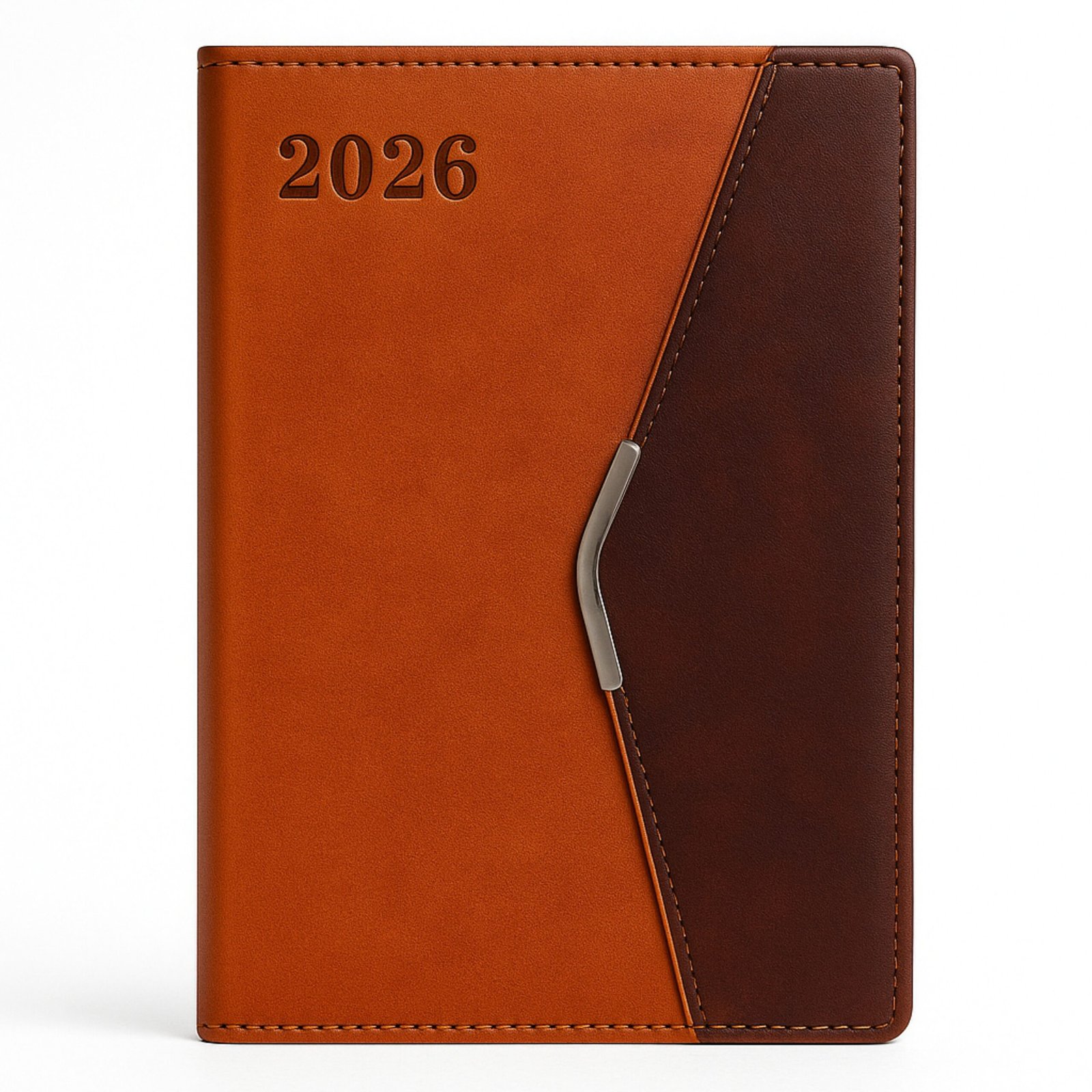 This stylish A5 2026 diary features a modern dual-tone PU cover with a premium metal curve magnetic flap. Designed for executives and business users, it combines style with practicality and durability.