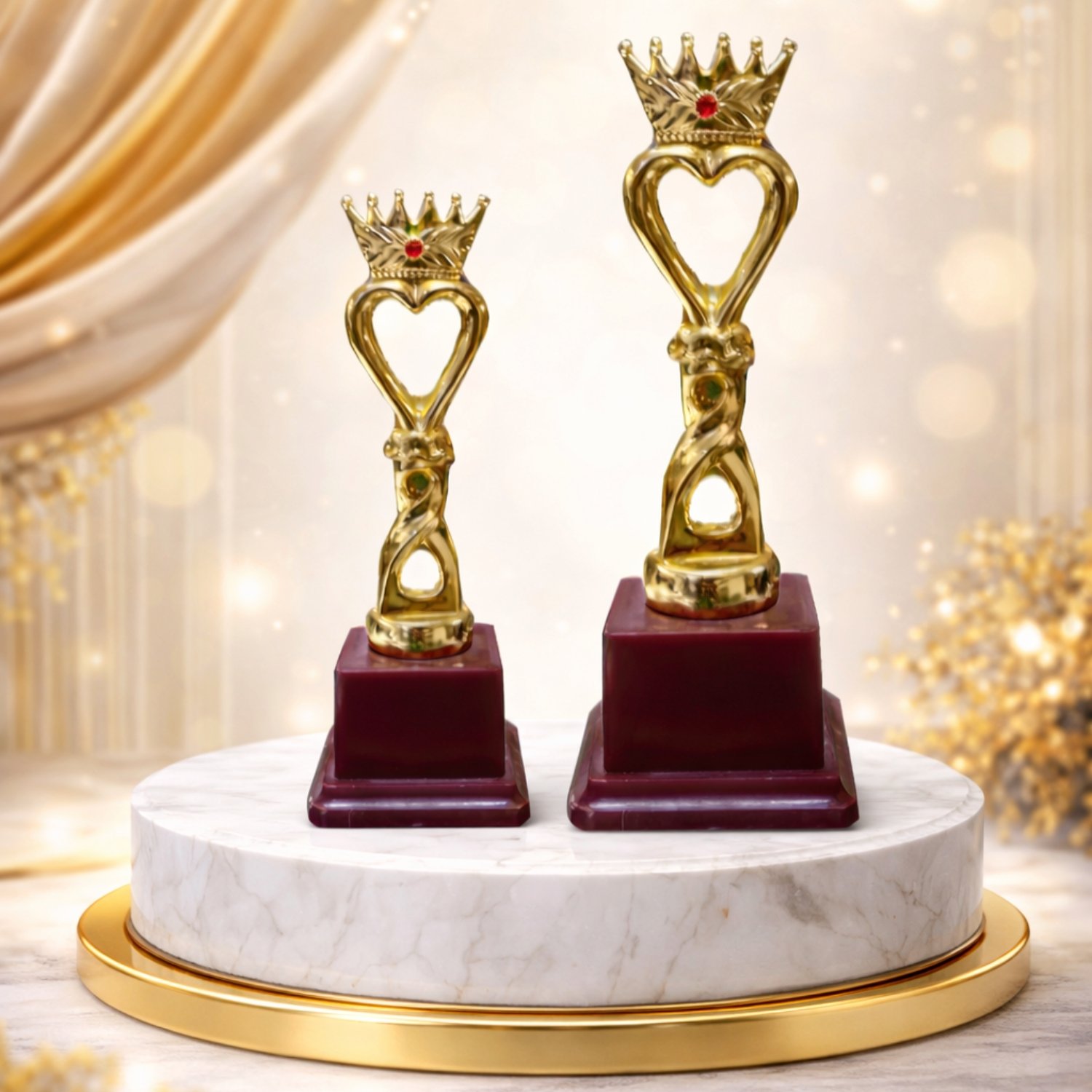 Elevate your award ceremonies with this elegant Royal Crown Heart Trophy, designed to symbolize excellence, honor, and achievement. Featuring a graceful heart-shaped body topped with a majestic crown, this trophy is finished in rich gold with decorative stone accents. The sturdy premium base adds stability and a luxurious look, making it perfect for corporate events, school functions, cultural programs, and special recognitions.