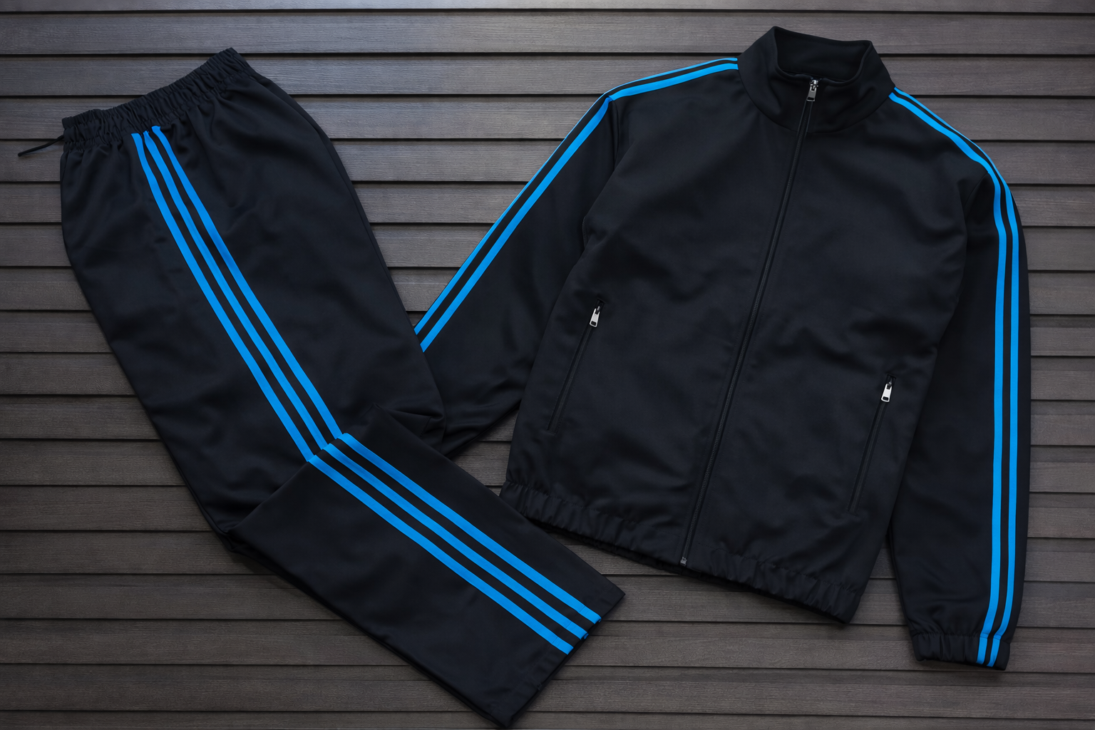 The suit features a full front zipper and side pockets for convenience, while the matching track pants come with an elastic waistband for a secure and flexible fit. The contrasting blue side stripes add a modern, sporty look, making it suitable for teams, schools, clubs, gyms, and corporate sports events.