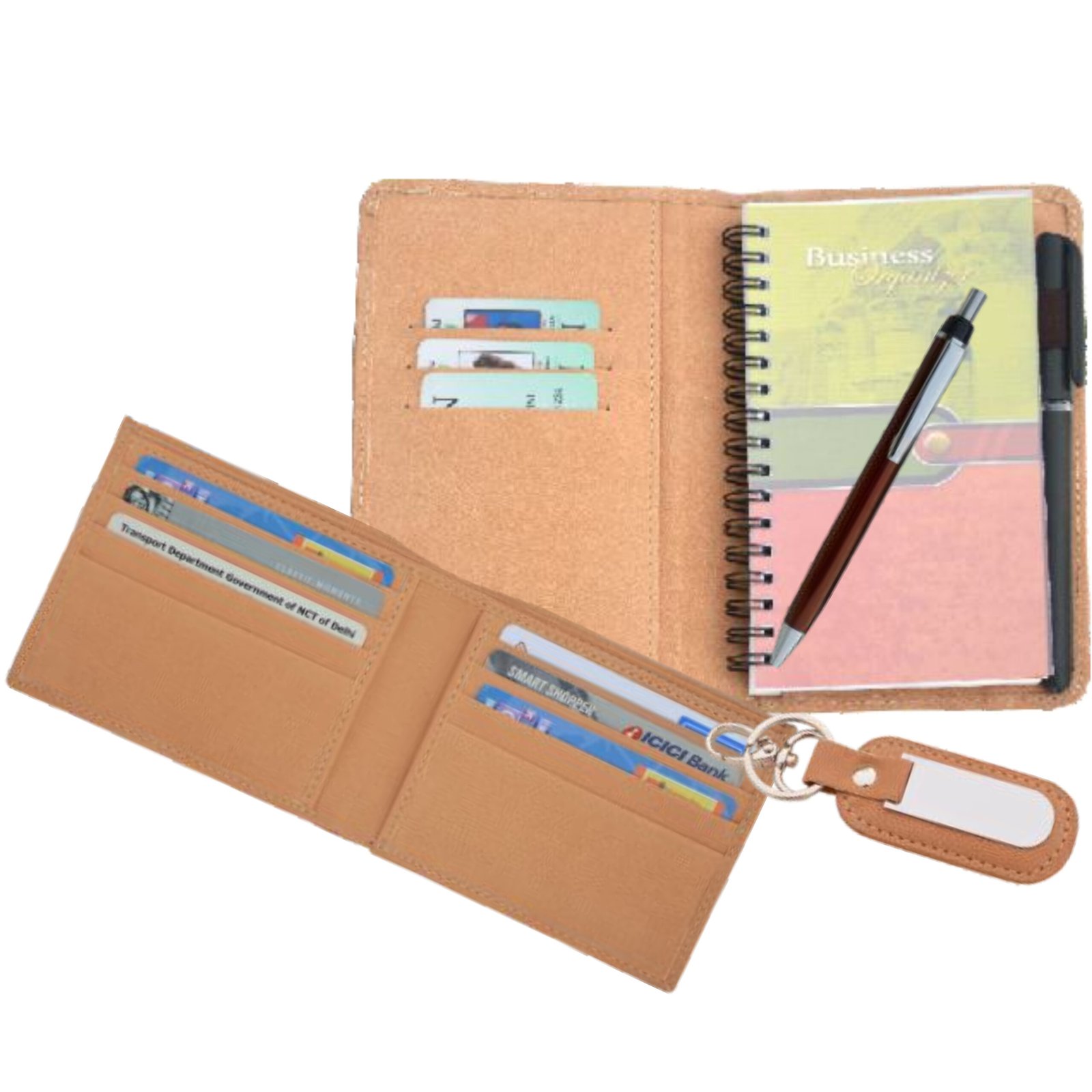 ₹1,100.00A stylish and functional 4-in-1 corporate gift set featuring a B7 Dateless Wire-O Diary, Gents Wallet, Metal Ball Pen, and a Key Ring with Dog Hook. Designed in elegant Black/Camel shades, this combo is perfect for corporate gifting, events, promotions, and premium giveaways.