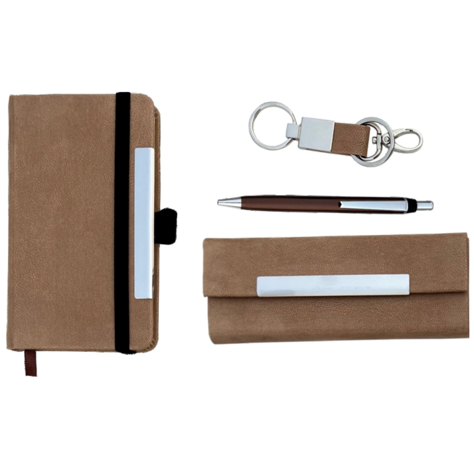 A compact and elegant 4-in-1 corporate gift set featuring essential everyday accessories. This premium combo includes a palm-size hardbound notebook, a mini unisex wallet, a stylish metal ball pen, and a vegan-leather key ring with dog-hook fitting. Perfectly packed in a high-quality gift box, making it an ideal choice for corporate gifting and events.