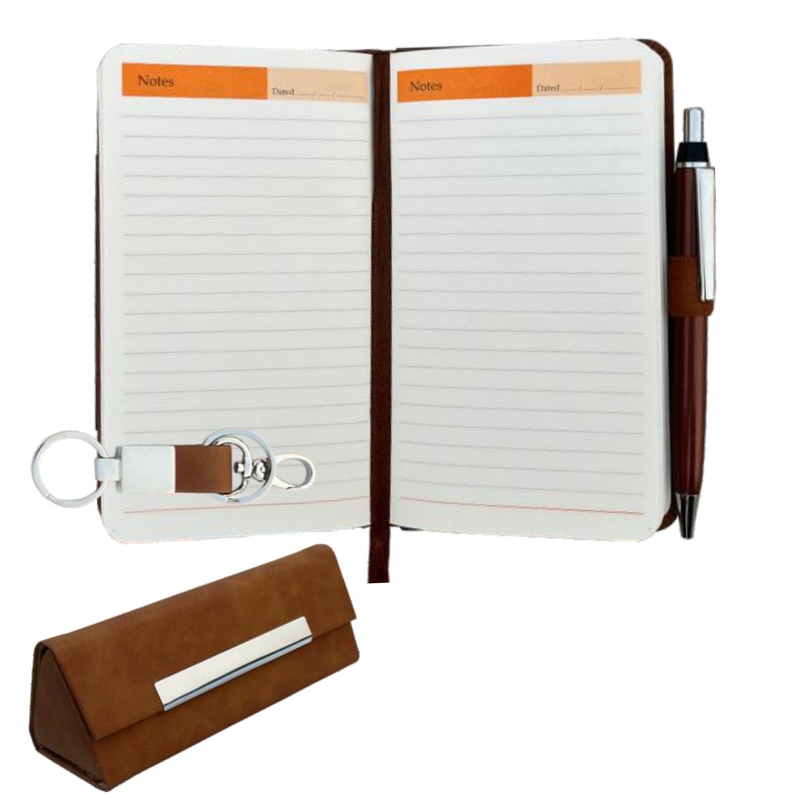 A sophisticated and multifunctional 4-in-1 gift set crafted from premium vegan leather, ideal for corporate gifting, events, employee appreciation, and festive giveaways. This elegant combo includes a B7 Dateless Wire-O Diary, a Stylish Spectacle Case, a Metal Ball Pen, and a Key Ring with Dog Hook—all neatly packed in a premium box.