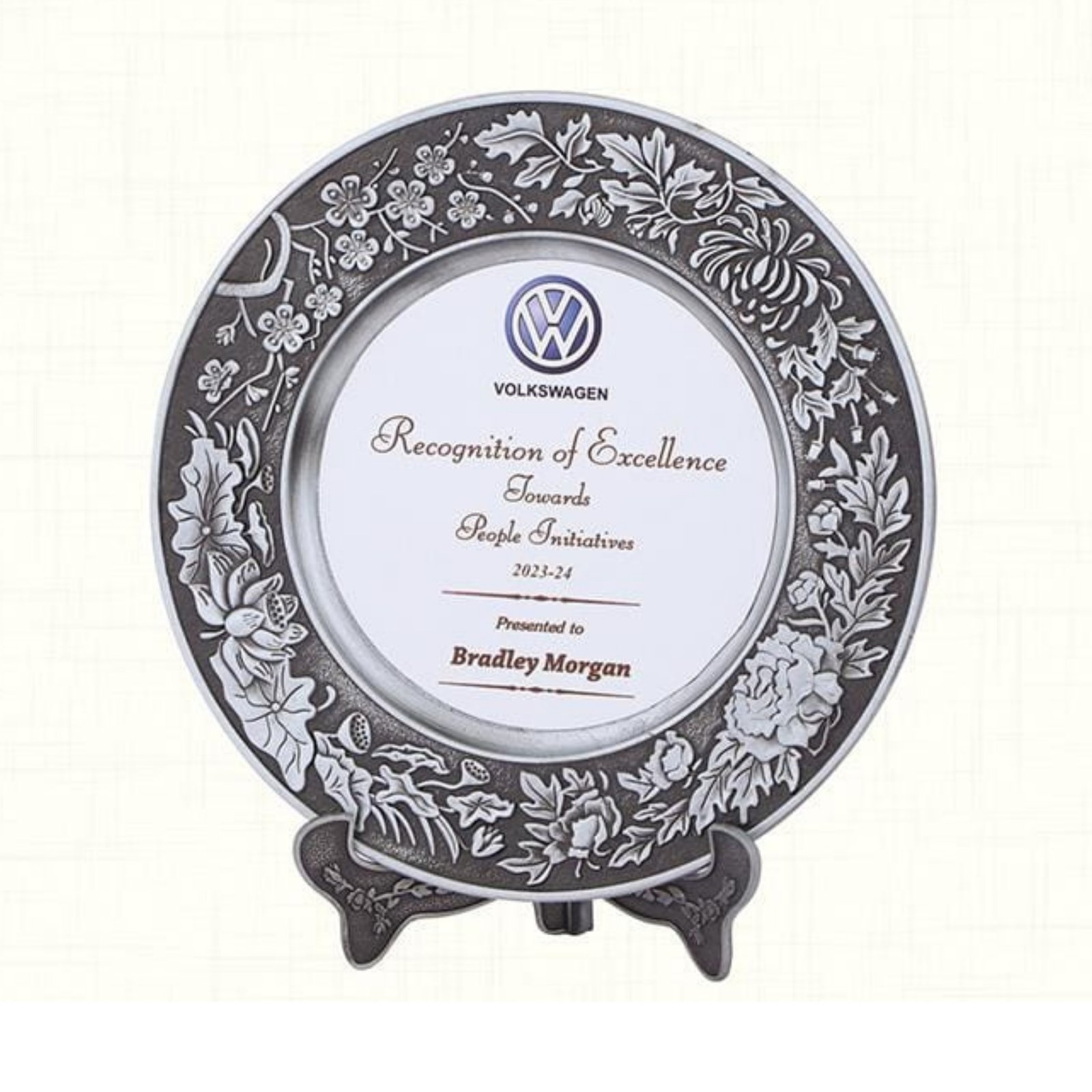 Add elegance and distinction to any award ceremony with this Customized Premium Silver Plate Memento. Featuring a beautifully crafted floral border and a polished center plate, this memento is perfect for honoring excellence, achievements, and special recognitions.