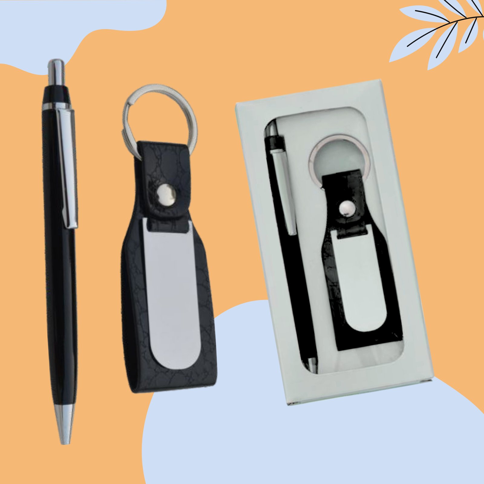 A stylish and practical 2-in-1 gift combo featuring a premium metal ball pen and a vegan leather key ring, elegantly packed in a cardboard window box. Ideal for corporate gifting, events, promotions, and personalized branding.