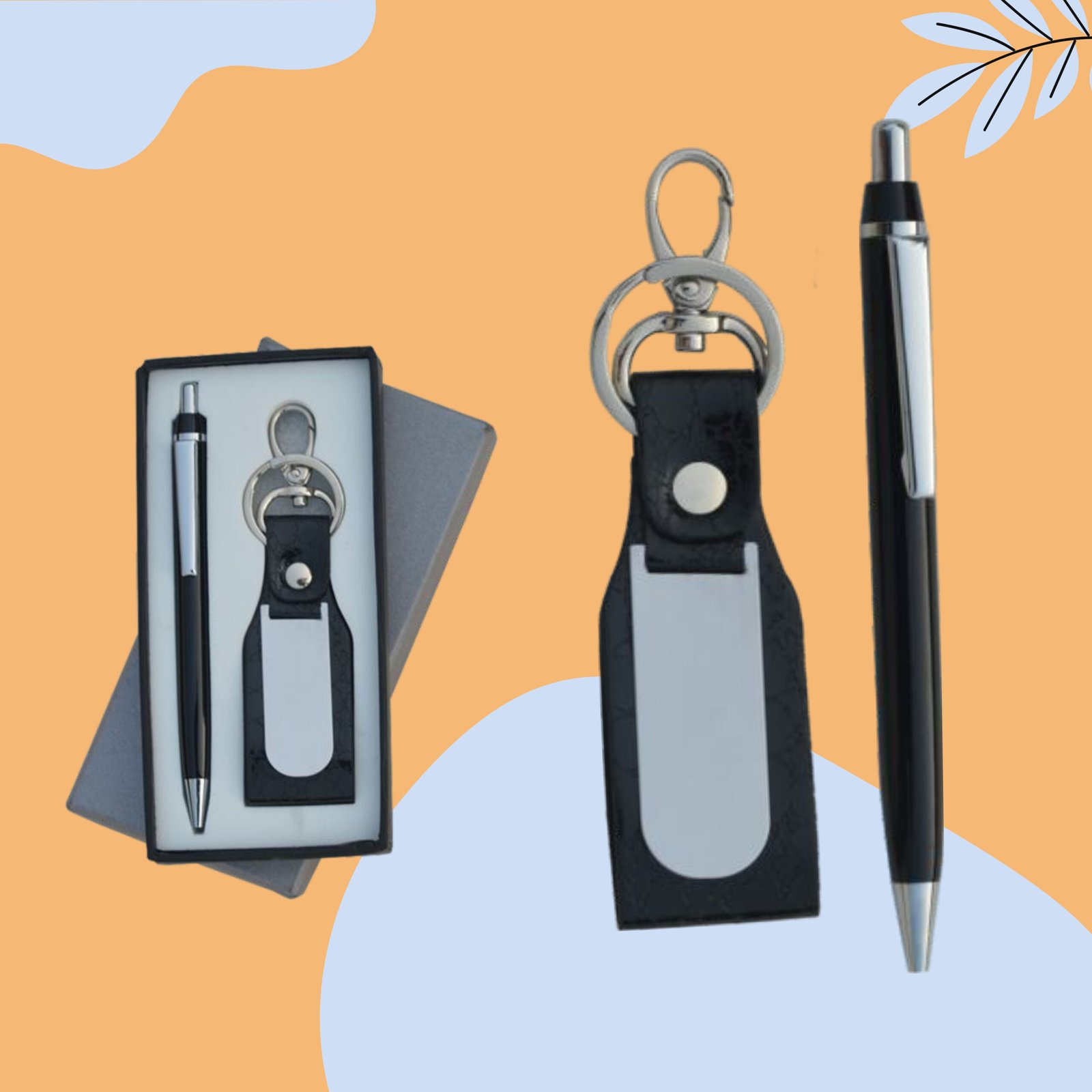 A premium 2-in-1 gift set featuring a sleek metal ball pen paired with a durable vegan leather key ring equipped with a dog-hook fitting. Packed in an elegant cardboard gift box, this combo is ideal for corporate gifting, employee appreciation, promotional events, and custom branding.