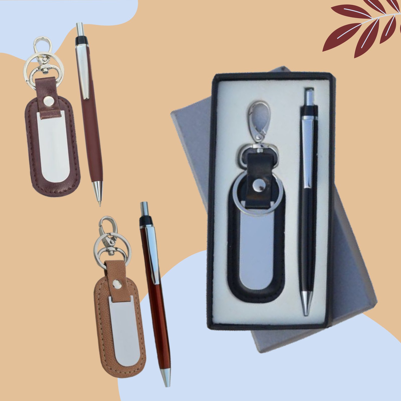 A stylish 2-in-1 gift combo featuring a premium vegan leather key ring with dog-hook fitting paired with a sleek metal ball pen. Neatly packed in a high-quality cardboard gift box, this set is perfect for corporate gifting, promotional giveaways, events, and personalized branding.