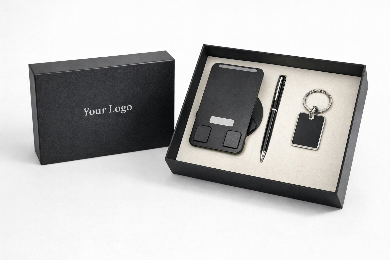 The 3-in-1 Premium Executive Gift Set – Model H975 is a modern and practical corporate gifting solution designed for professionals, businesses, and promotional branding. This elegant gift set includes a foldable mobile stand, metal ball pen, and a premium metal keychain, neatly packed in a luxury presentation box.